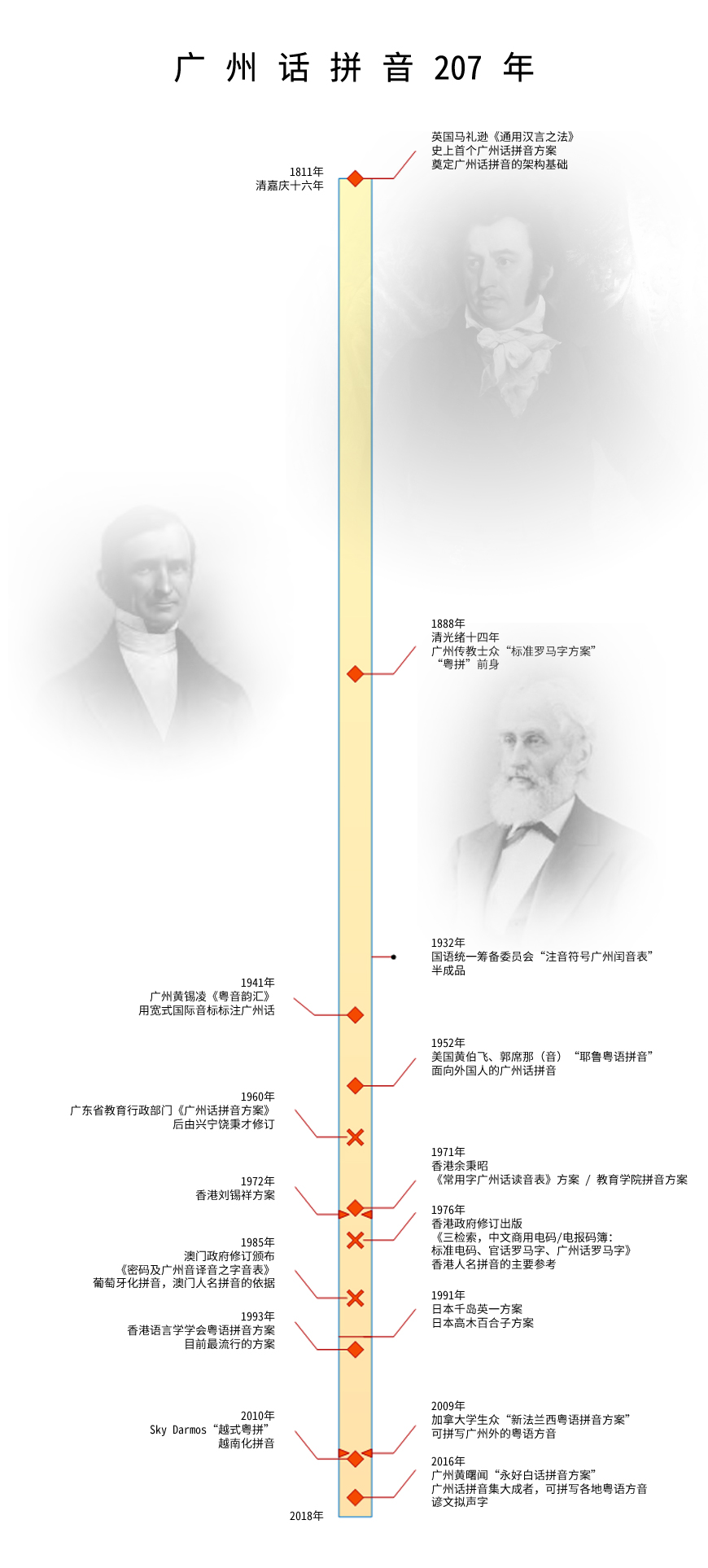 广州话系汉语的一种,既继承了秦音汉韵,又不断产生和吸纳新词汇与时俱进,素来以“历史悠久,留存古音”、“能逐字读出古今各种书籍之汉字”、“既可用于通俗的生活交流,亦能表达各种高新科技、深奥思想”而为人所自豪和称道。 据司马迁《史记》记载,广州早在西汉时已经是闻名天下的九大商业城市之一。绵延两千多年至今,广州一直都是举足轻重的对外文化交流窗口。所以,广州话很早就与对外交流出现交集。 与其他汉语姊妹一样,广州话最早是使用反切等古法进行注音的。一开始,使用外文去记录广州话,或用广州话将外文转译成汉字,都仅限于人名地名等专有名词,而未形成系统的方案。系统的广州话拼音方案,始诞生于清嘉庆十六年(1811年)。经过多代人的努力,至今207年间,单论应用广泛或别具特色的拼音方案,计有16种。除此之外,诸如赵元任的“粤语罗马字”等其他多种方案,由于或不具代表性、或缺乏特色等原因,略过不表。 下面,就让我们顺着时间的细线,重温一下广州话拼音二百余年的成长历程: 清嘉庆十二年(1807年),时年25岁的英国传教士马礼逊离开家乡,孤身一人漂洋过海,经美国辗转进入人生地不熟的广州。一个人可以做什么?历史会因一个人的意志而谱写新的篇章吗?尽管困难重重,但马礼逊凭着过人的毅力和能力交出了答案。他在历史汪洋中制造了一个涟漪,正是这个微不足道的涟漪为广州话注入了全新的生命活力,令广州话向世界跨出了改变命运的重要一步。清嘉庆十六年(1811年),马礼逊归纳广州音写成《通用汉言之法》,并于4年后的清嘉庆二十年(1815年)出版。基于英语发音的广州话拼音由此诞生。清道光八年(1828年),又再出版《广东省土话字汇》,奠定了广州话拼音的架构基础。自此,广州话正式与世界接轨。而传承着广州话的后世的我们,亦得以上溯二百几年,重温祖先的腔调和用语,感受广州话经年累月的点滴变迁。 两年后,清道光十年(1830年),日后的美国汉学奠基人——时年29岁的传教士裨治文抵达广州。又三年后,清道光十三年(1833年),日后的美国首位汉学教授——时年21岁的传教士卫三畏抵达广州。至此,三位推动广州话拼音发展的先行者走到了一起。 月有阴晴圆缺,人有悲叹离合。清道光十四年(1834年),马礼逊逝于广州家中,享年52岁。追随其步伐的裨治文和卫三畏两人,采用改良过的《通用汉言之法》方案,分别于清道光二十一年(1841年)出版了《广东省土话汉言读本》——美国人撰写的第一部汉语教材;及于清咸丰六年(1856年),出版了根据《分韵撮要》编译而成的《英华分韵撮要》。 此后,欧美传教士时有广州话新作。期间,虽然有若干广州话拼音方案,但直到清光绪十四年(1888年)为止,这些方案其实都是基于马礼逊的《通用汉言之法》方案略加变化而成的。这一年,广州多名传教士联手编制了“标准罗马字方案”。该方案不但在当时迅速风靡,而且在日后被沿用到中文电报码上,更成为了香港人名拼音的主要参考来源,还有就是,标准罗马字方案即当今最流行的“粤拼”的前身。 1932年,国语统一筹备委员会为注音符号增加了广州闰音表。但注音符号本为官话服务,广州闰音表既称“闰音”,自然不指望能得到重视。该方案一来无法精确还原广州音,二来没有加入到字符集导致无法直接在电脑上显示或录入,三来实质是披着汉字外表的四不象,四来没有进行推广更缺乏系统学习资料,因此是一个失败的半成品。由于设计颇具特色,所以顺便交代一下,但完全没有学习的必要。 1941年,广州岭南大学的黄锡凌出版《粤音韵汇》,首创以宽式国际音标为汉字标注广州话。 1952年,美国耶鲁大学的黄伯飞与郭席拿(音)为所在大学编写了耶鲁粤语拼音(草稿,出版年份为1958年),该方案长期应用于面向外国人的广州话教学。由于后来修订过,所以最初的方案就称之为“耶鲁正统”,而修订后的方案就直接叫“耶鲁”。 1960年,广东省教育行政部门编写了《广州话拼音方案》,后来《广州音字典》作者,兴宁的饶秉才对该方案进行了修订。该方案主要应用于广州。 1971年,香港的余秉昭在其作品中使用了一个对应宽式国际音标的罗马字方案。1990年,香港教育署语文教育学院(现香港教育学院)在《常用字广州话读音表》中对方案进行了修订。后被称为《常用字广州话读音表》方案或教育学院拼音方案,简称“教院式”。 1972年,香港的刘锡祥在其作品中使用了刘锡祥拼音,该方案最大的特色是标记变调。 1976年,香港政府修订出版《三检索,中文商用电码/电报码簿:标准电码、官话罗马字、广州话罗马字》,作为香港入境事务处为市民登记出生姓名拼音的检索工具书。 1985年,澳门政府修订1933年的字音表,颁布基于葡萄牙语发音习惯的《密码及广州音译音之字音表》(注:密码指标准电码),以作为澳门人名拼音的依据。 1991年,日本出现了两种广州话拼音方案,分别是高木百合子方案和千岛英一方案。关于高木百合子,还有一段轶事。此处的高木百合子并非日本王妃,而是广州华南师范大学的留学生。受父亲影响,高木百合子于1983年携夫来广州留学,期间女儿在广州出生,因此命名为“穗”(广州的简称)。通过和托儿所的本地小朋友交流,穗女也和妈妈一样,掌握了流利的广州话。回到日本后,高木百合子母女延续了对广州话的兴趣。最终,诞生了高木百